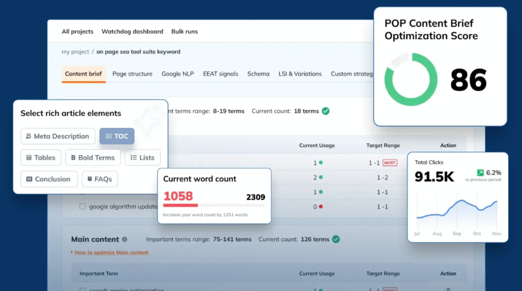 PageOptimizer Pro (POP) is one of the top on-page SEO tools powered by AI analysis of ranking pages. Made famous by Kyle Roof in the SEO community, POP gives precise, data-driven recommendations for optimizing your content especially for ranking on-page elements like headers, lists, and structure.