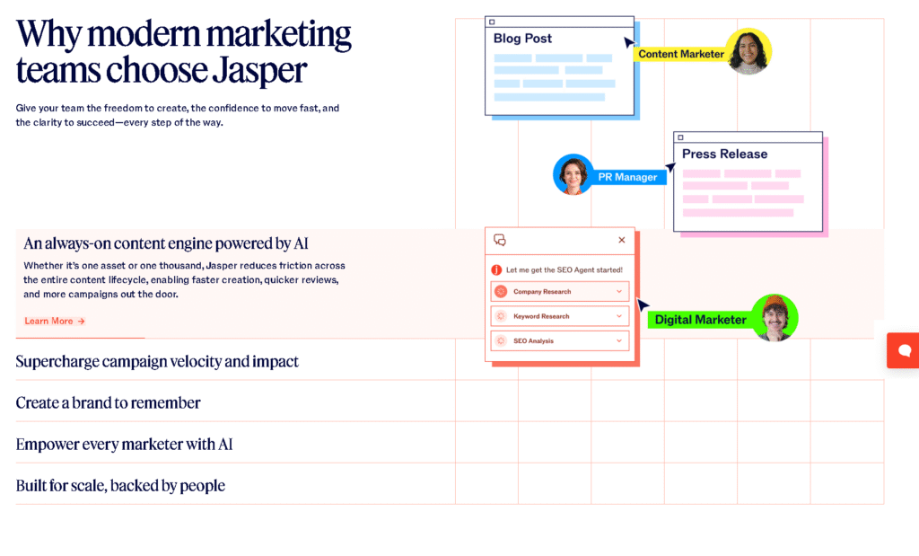 | Jasper SEO Mode | From $39/mo | AI Content Creation | AI content plus SEO integration | jasper.ai |