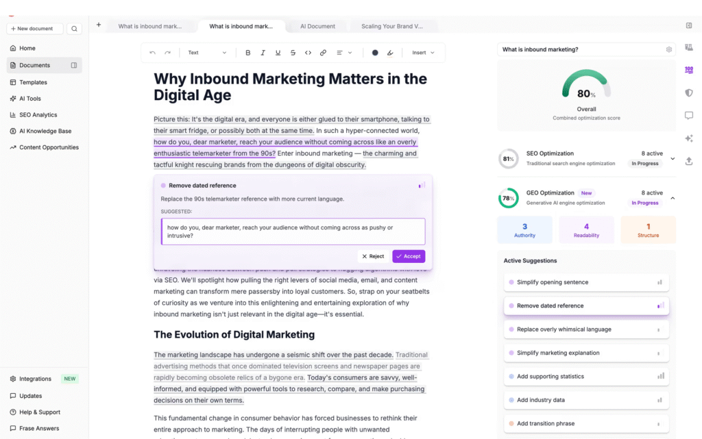 Frase is one of the best AI content optimization tools built specifically for SERP and topic research. It examines the top results on Google and creates AI-generated content briefs, questions, and headers your article should cover to rank better. It’s especially powerful for content teams that need topic clustering and fast research.
