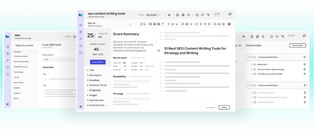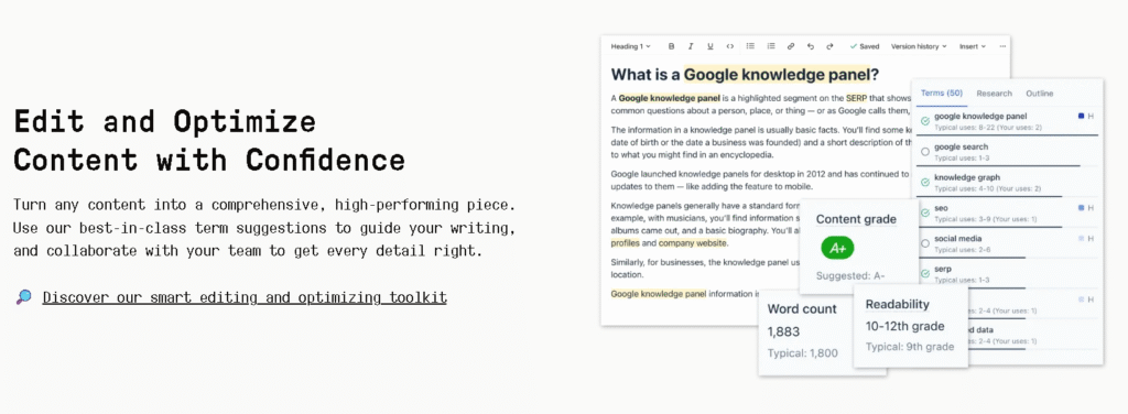 NeuronWriter is an ultra-focused on-page optimization tool powered by NLP and SERP analysis. It helps writers optimize copy for readability, relevance, and semantic richness. You get content outlines, competitor data, and suggested phrases all built around Google’s latest NLP standards.
