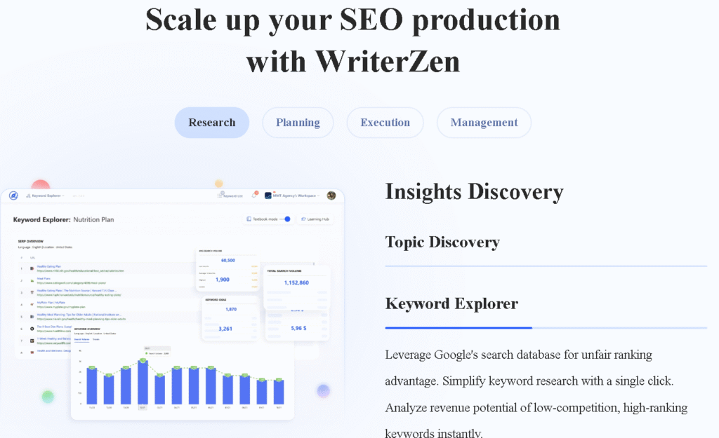 WriterZen is a smart semantic keyword research and content optimization tool. It excels at keyword clustering based on intent and semantics, helping you create high-ranking article maps in less time. With integrated plagiarism checker and AI assistant, it’s a strong contender for small businesses looking at affordable solutions.