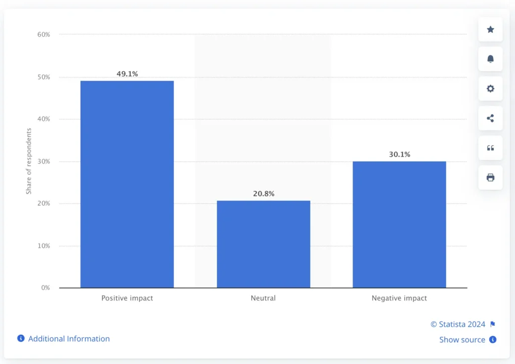 According to Statista, 49.1% of 3,812 respondents in 2023 believe AI will positively impact website search traffic in the next five years.