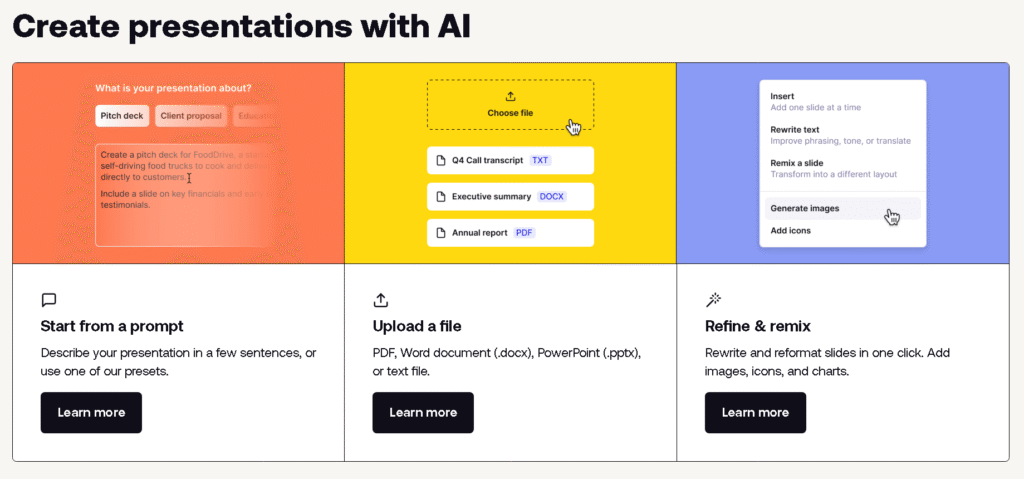 Canva’s AI slide generator combines stunning templates with drag-and-drop design freedom. This tool is ideal if you want custom visuals alongside your deck.