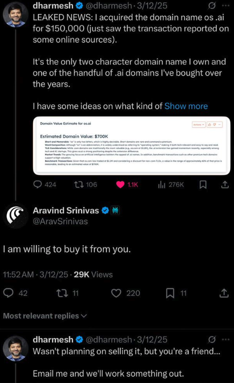 - Dharmesh Shah, already known for his strategic plays in the domain market, confirmed that he sold os.ai to Perplexity AI. The sale not only cements Perplexity’s ambitions beyond AI-powered search but also made Shah a “somewhat larger shareholder” in the company, suggesting the deal was at least partly equity-based.