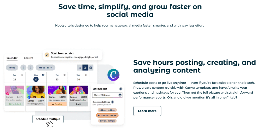 HootsuiteStarting $99/monthEnterprises, AgenciesAI scheduling & analyticshootsuite.com