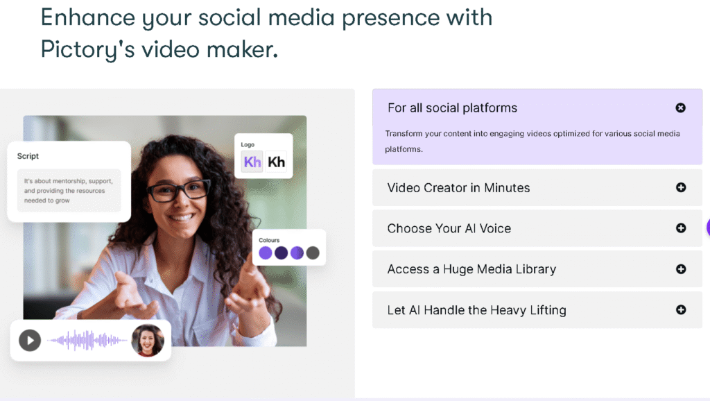Pictory uses AI to turn blog articles, podcasts, and scripts into short, shareable videos. It’s ideal for brands who want to extract more value from their long-form content especially on platforms like TikTok, Instagram Reels, and YouTube Shorts.