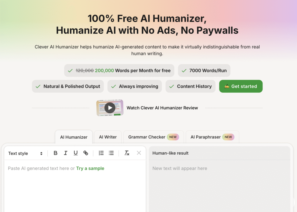 Clever AI Humanizer100% freeBeginners, Small Businesses100% free with no ads or paywallscleverhumanizer.ai